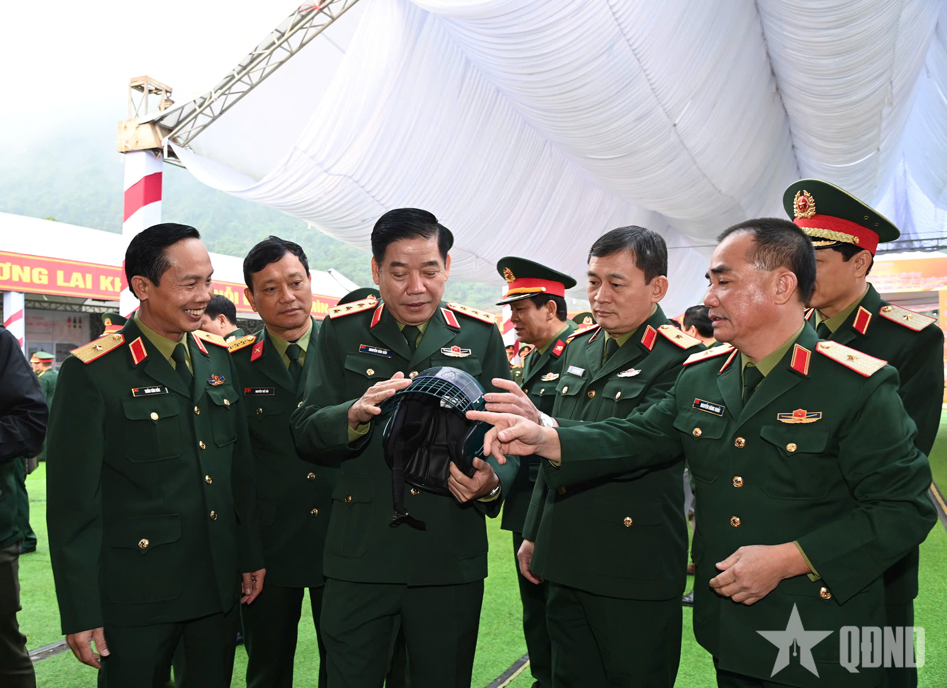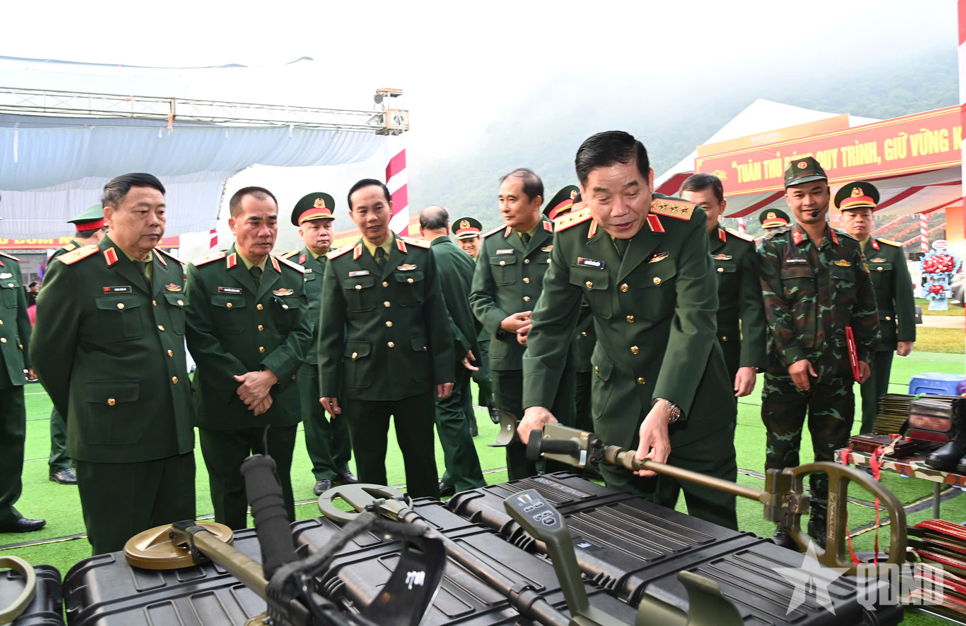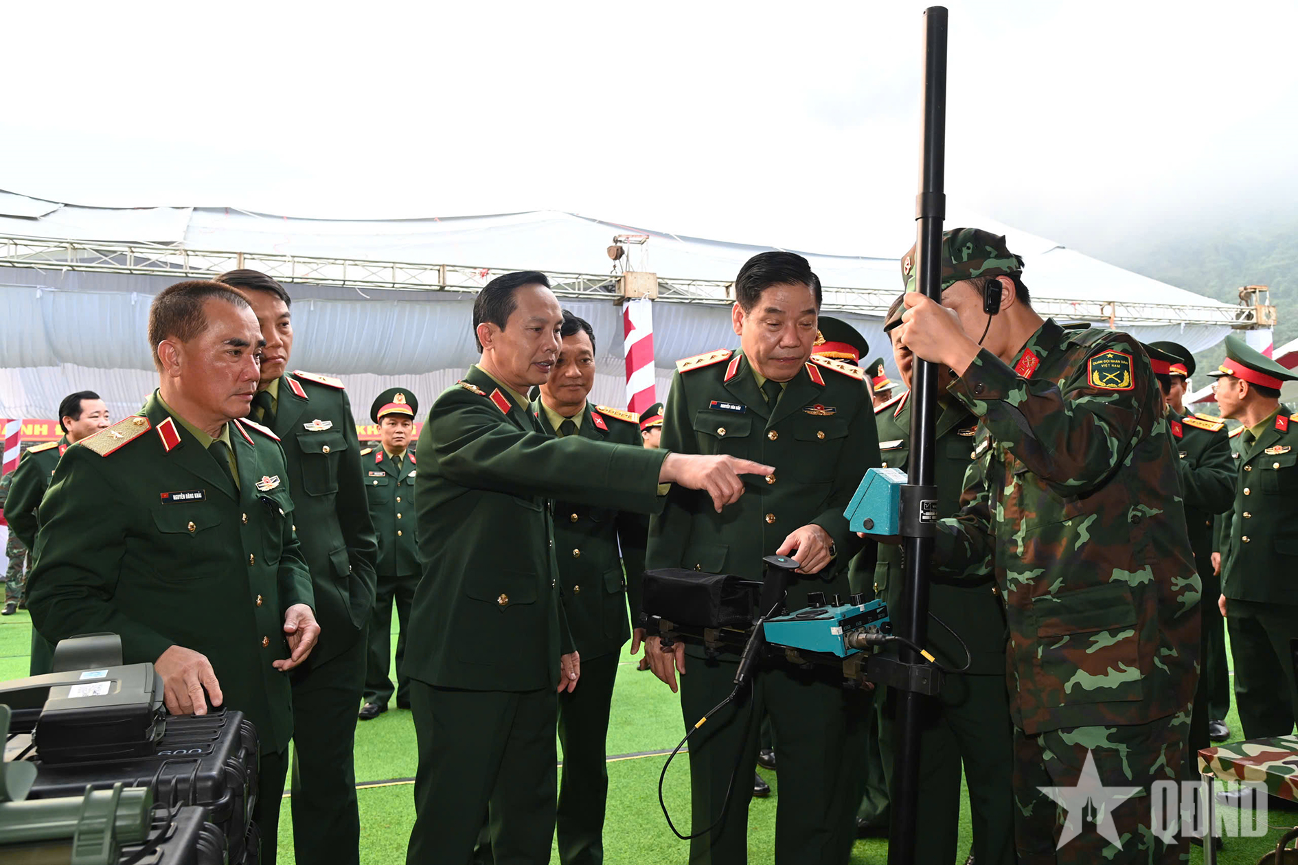 Thượng tướng Nguyễn Văn Gấu và các đại biểu tham quan khu vực trưng bày các trang thiết bị rà phá bom mìn của Lực lượng Công binh Quân khu 2.