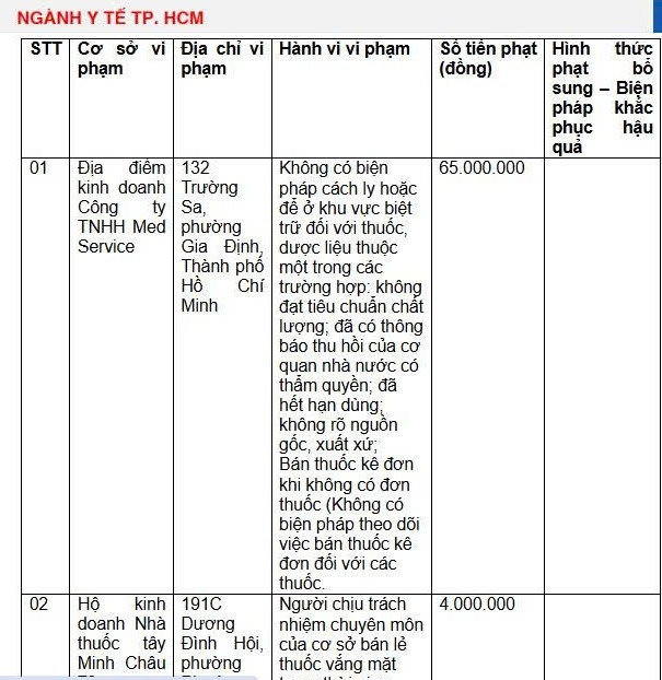 Cụ thể, địa điểm kinh doanh Công ty TNHH Med Service (132 Trường Sa, phường Gia Định, TP Hồ Chí Minh) vừa bị Sở Y tế TP Hồ Chí Minh xử phạt 65 triệu đồng. Lý do xử phạt do công ty dính nhiều sai phạm như: Không có biện pháp cách ly hoặc để ở khu vực biệt trữ đối với thuốc, dược liệu thuộc một trong các trường hợp: không đạt tiêu chuẩn chất lượng; đã có thông báo thu hồi của cơ quan nhà nước có thẩm quyền; đã hết hạn dùng; không rõ nguồn gốc, xuất xứ; Bán thuốc kê đơn khi không có đơn thuốc (Không có biện pháp theo dõi việc bán thuốc kê đơn đối với các thuốc).