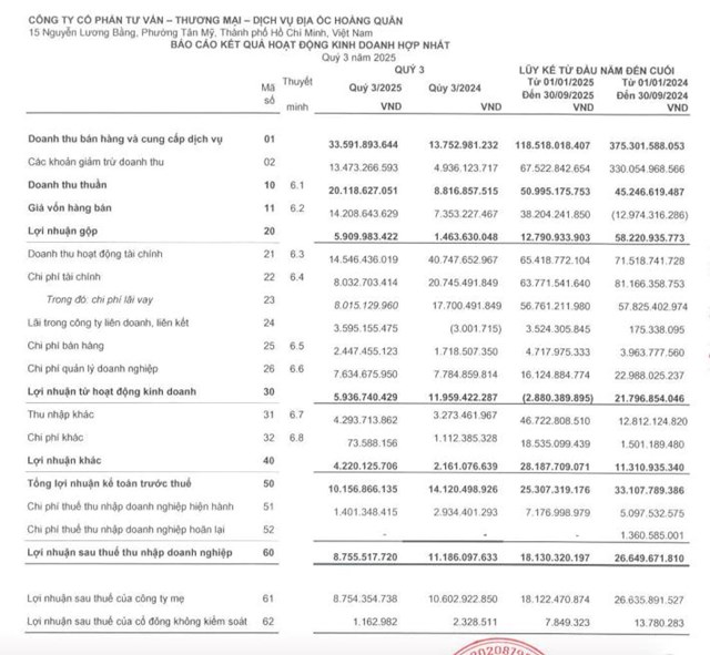 Theo báo cáo kết quả kinh doanh hợp nhất quý III/2025 của CTCP Tư vấn Thương mại Dịch vụ Địa Ốc Hoàng Quân (mã ck: HQC), doanh nghiệp ghi nhận doanh thu thuần đạt 20,1 tỷ đồng, gấp 2,3 lần cùng kỳ năm ngoái.