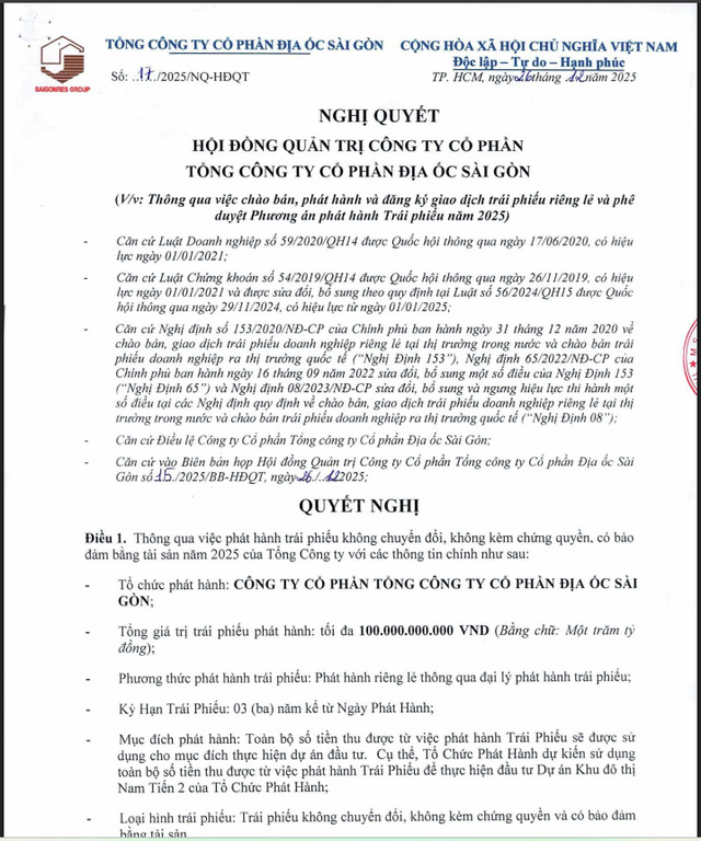 SGR vừa vừa công bố Nghị quyết về thông qua việc chào bán,phát hành và đăng ký giao dịch trái phiếu riêng lẻ và phê duyệt Phương án pháthành trái phiếu năm 2025.