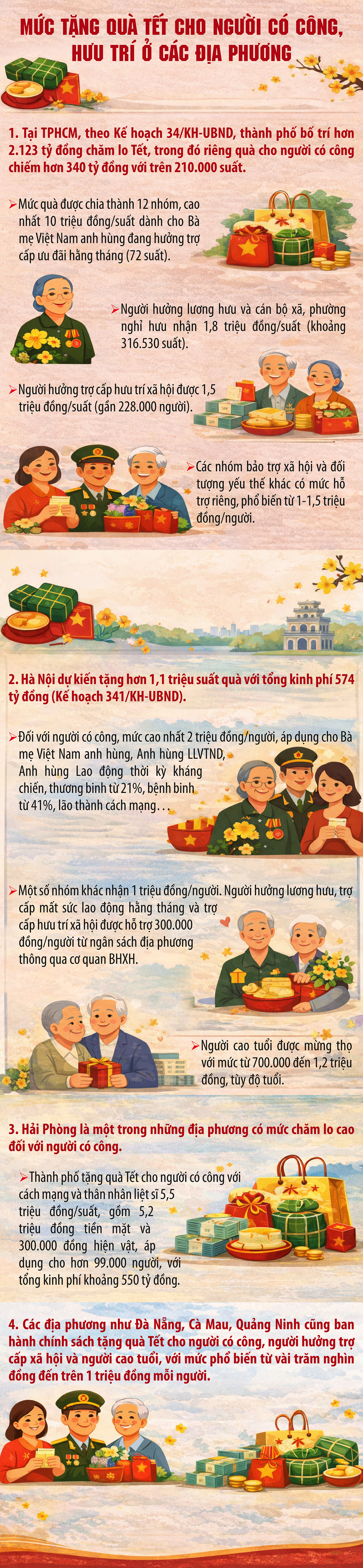 Bên cạnh quà Tết của Chủ tịch nước, nhiều địa phương sử dụng ngân sách địa phương để tặng thêm quà hoặc hỗ trợ tiền mặt cho người có công, gia đình chính sách, thân nhân liệt sỹ. Mức hỗ trợ, phạm vi đối tượng và hình thức chi trả do từng địa phương quyết định, căn cứ khả năng cân đối ngân sách và tình hình thực tế.