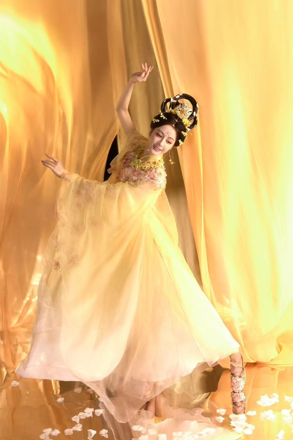 Địch Lệ Nhiệt Ba diện trang phục màu vàng huyền ảo như ánh trăng với kiểu tóc vấn cao gợi liên tưởng đến nhân vật Hằng Nga trong phim Tây Du Ký kinh điển. Nhiệt Ba vốn có gương mặt lai Tây nhưng chẳng ngờ khi mặc đồ cổ trang, cô vẫn đủ sức biến hình thành chị Hằng đầy tươi vui, nhí nhảnh.