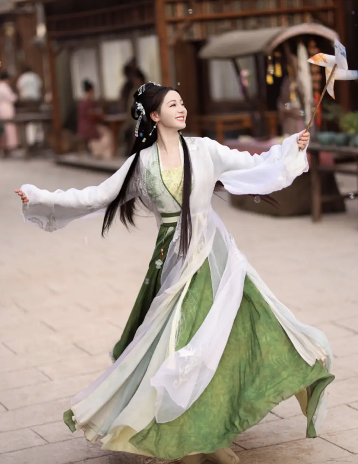Địch Lệ Nhiệt Ba diện trang phục mang phong cách Hán phục với gam xanh pastel chủ đạo, kết hợp các lớp vải mỏng nhẹ và đường thêu tinh tế. Thiết kế không quá cầu kỳ nhưng lại tôn lên vóc dáng cân đối, thanh thoát của nữ diễn viên. Phần váy xòe nhẹ, rủ mềm giúp tổng thể tạo hình thêm phần bay bổng, phù hợp với không khí cổ trang và bối cảnh phim.