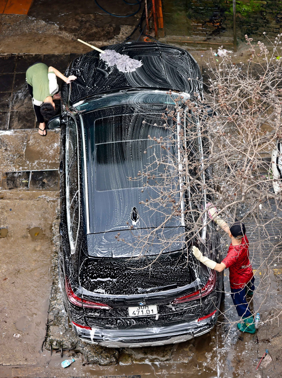 Người làm dịch vụ rửa xe luôn tay không nghỉ trong những ngày cận Tết. (Ảnh: Thanh Tùng/TTXVN)