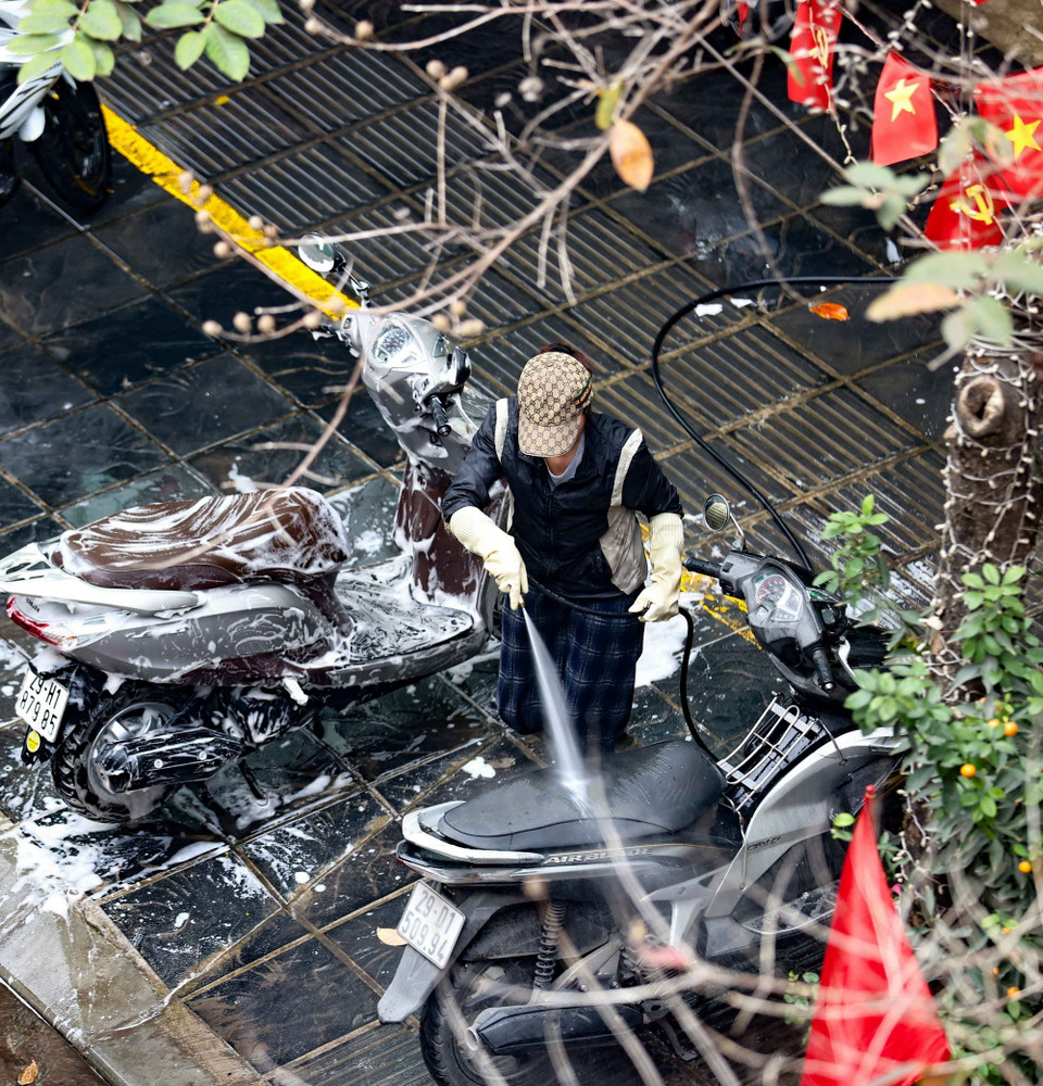 Những ngày cận Tết, giá rửa xe máy thường tăng thêm so với ngày thường. (Ảnh: Thanh Tùng/TTXVN)