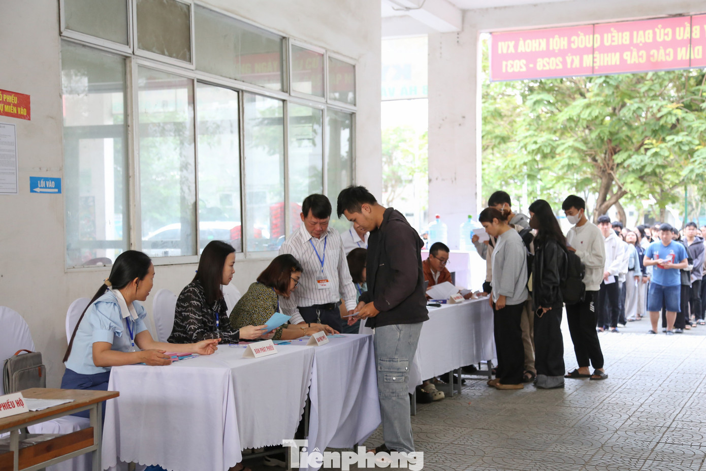 Sau khi dự lễ khai mạc, các cử tri gen Z xếp hàng ngay ngắn để chờ đợi vào khu vực bỏ phiếu, thực hiện quyền bầu cử.