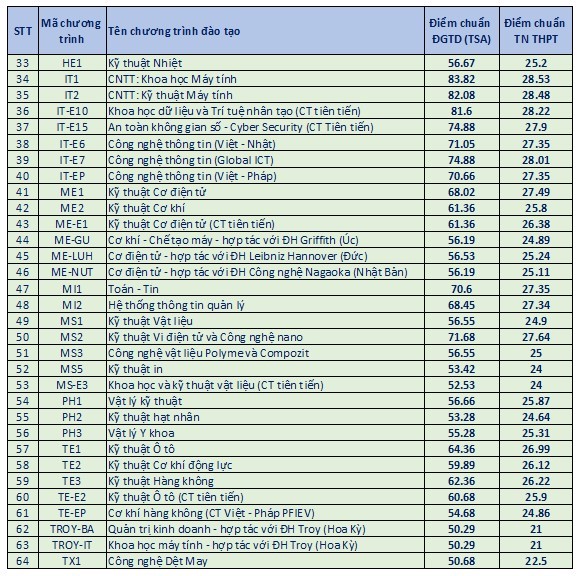 Chương trình Kỹ thuật máy tính (IT2) lấy điểm chuẩn là 82.08 đối với điểm thi ĐGTD (TSA) và 28.48 đối với điểm thi tốt nghiệp THPT, cao thứ hai năm nay. Kế đó chương trình Khoa học dữ liệu và Trí tuệ nhân tạo (IT-E10) với số điểm tương ứng là 81.6 và 28.22 điểm.