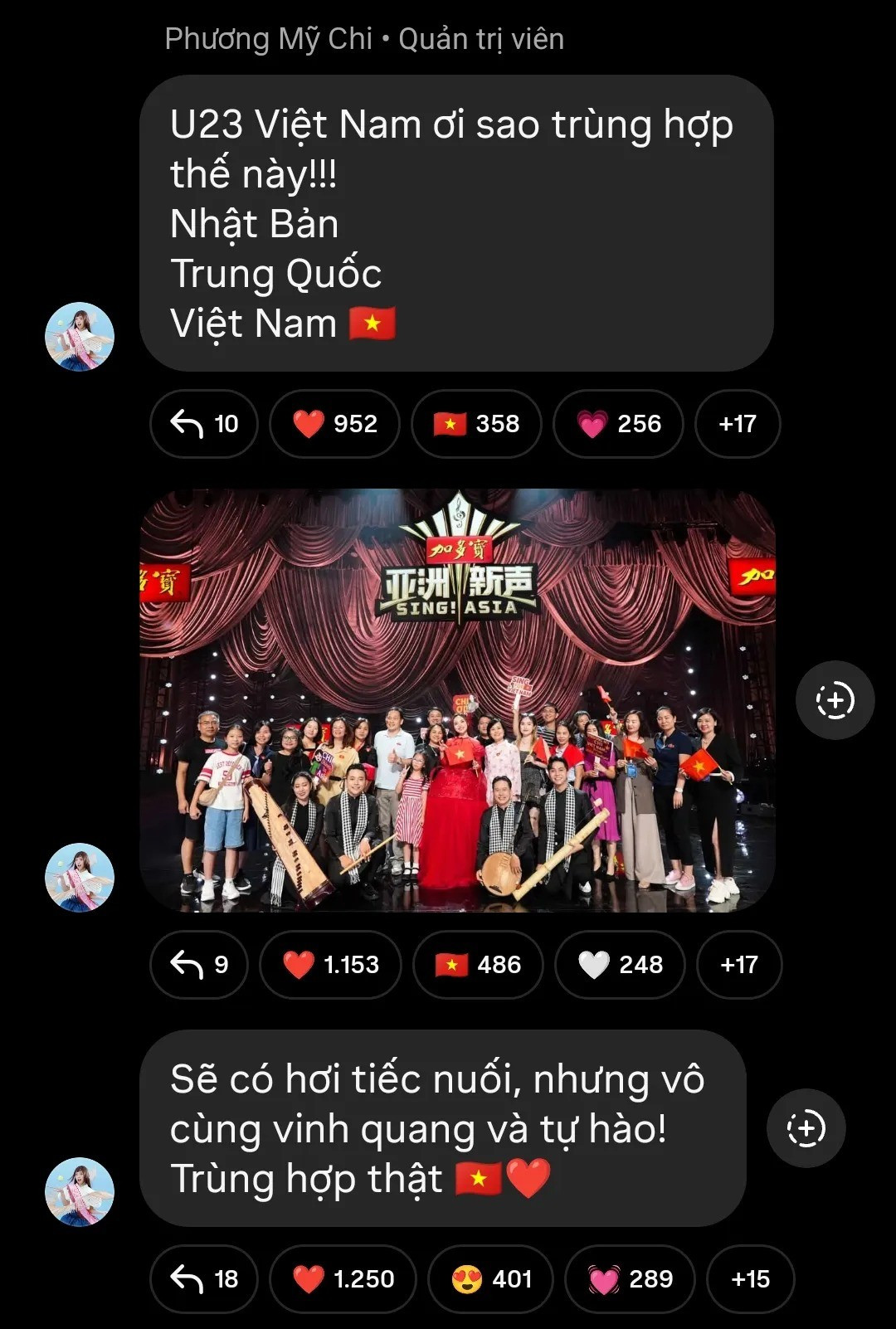 Cụ thể trên kênh broadcast của mình, Phương Mỹ Chi đã chia sẻ lại hình ảnh khi cô thi chương trình Sing! Asia, cùng với chú thích "U23 Việt Nam ơi sao lại trùng hợp thế này. Nhật Bản - Trung Quốc - Việt Nam". Vào thời điểm đó, Phương Mỹ Chi cũng dừng chân tại Top 3, còn Á quân và Quán quân lần lượt thuộc về hai đại diện Chu Phi Ca của Trung Quốc và Miyuna của Nhật Bản - trùng khớp với Top 3 của U23 châu Á 2026 vừa qua.