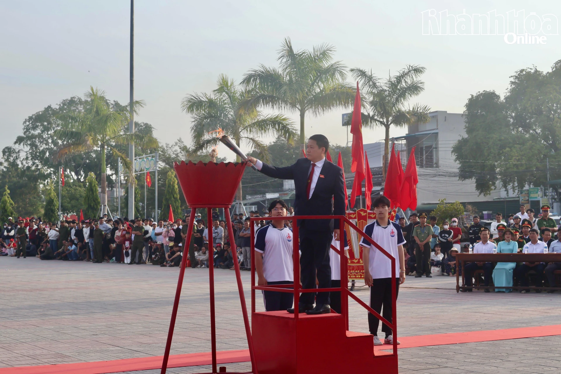 Lãnh đạo địa phương đốt đuốc trong buổi giao nhận quân.