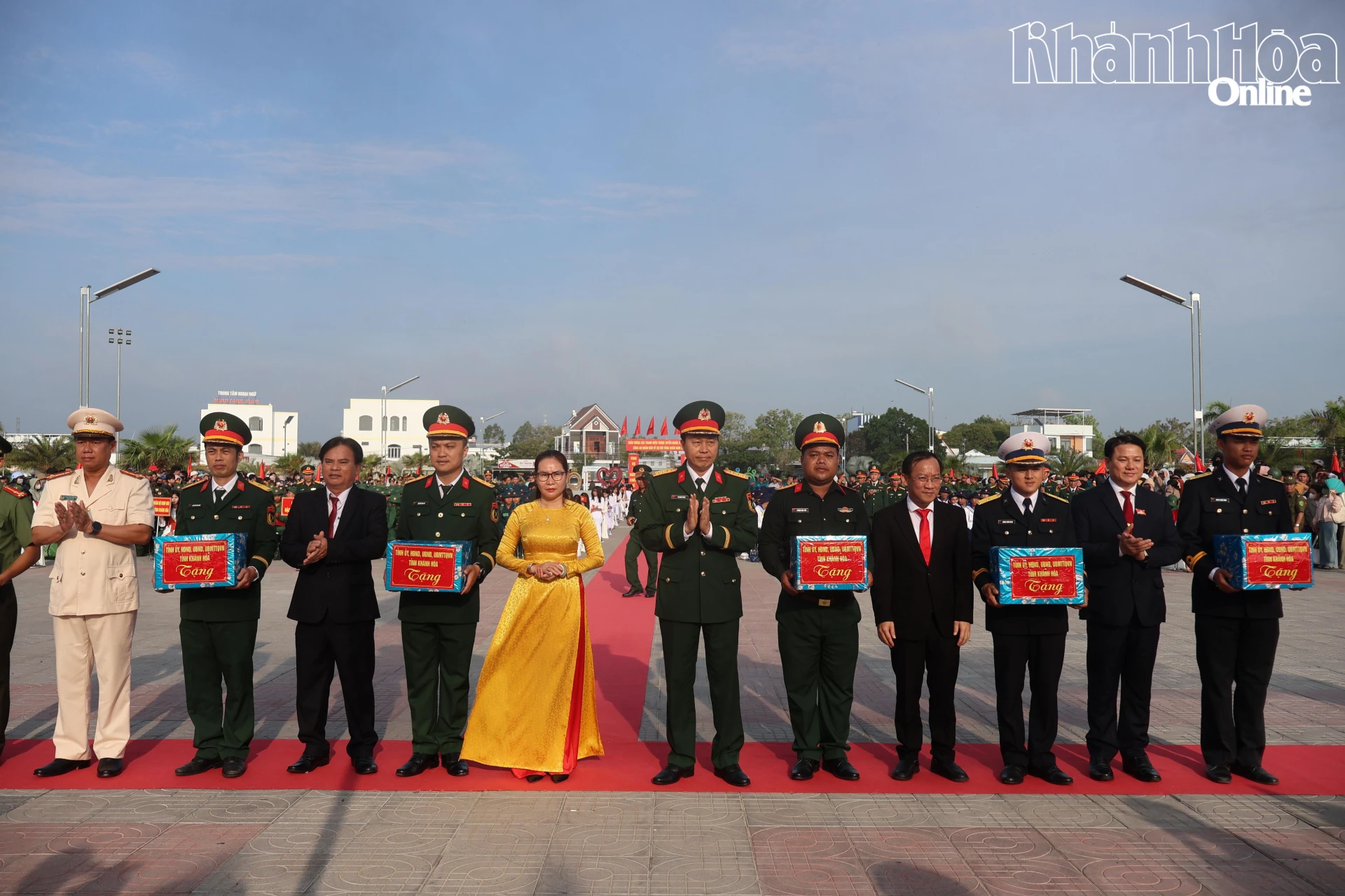 Đại tá Võ Quang Trung và lãnh đạo các địa phương tặng quà của Tỉnh ủy, HĐND, UBND, Ủy ban MTTQ Việt Nam tỉnh Khánh Hòa cho các đơn vị nhận quân.