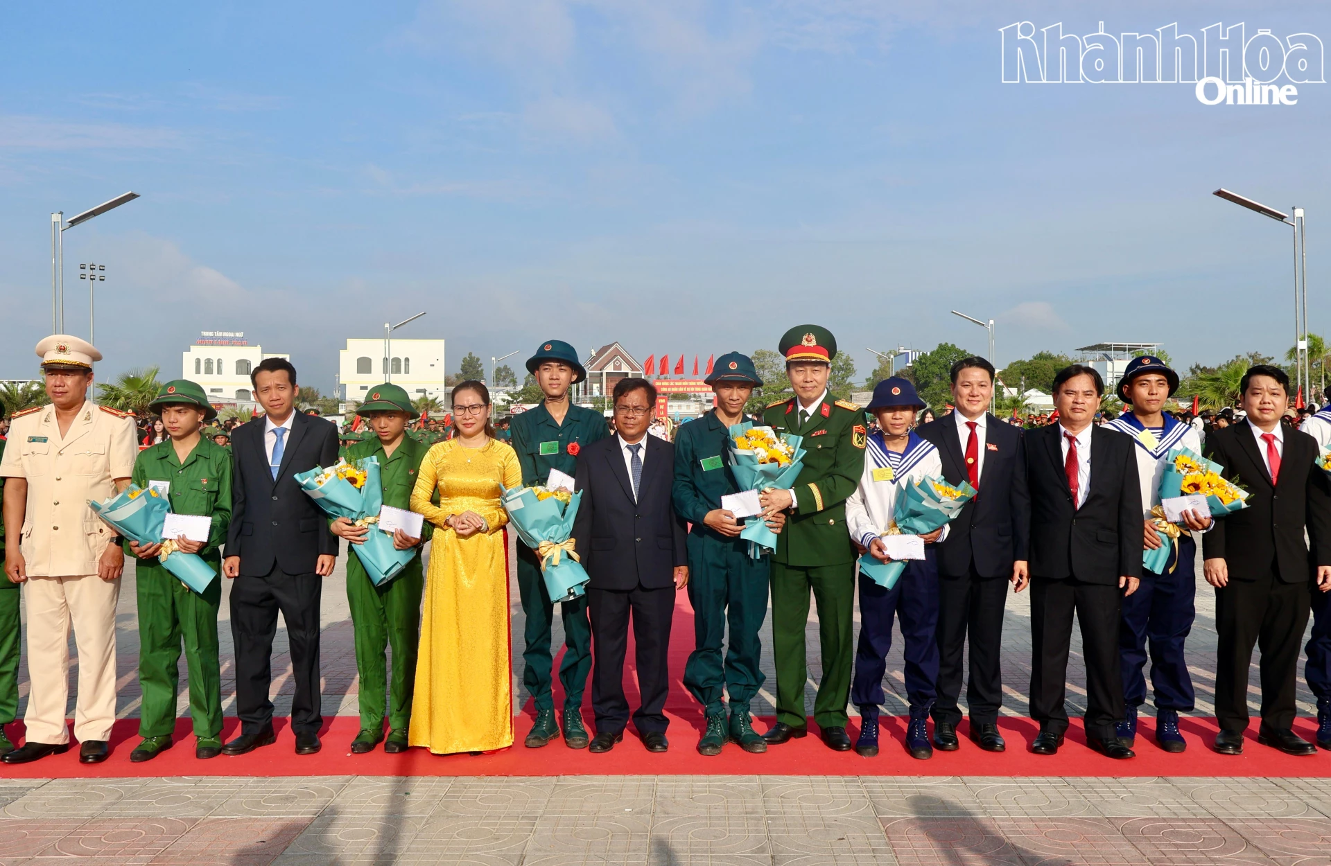 Đại tá Võ Quang Trung và lãnh đạo các địa phương tặng hoa cho các thanh niên.