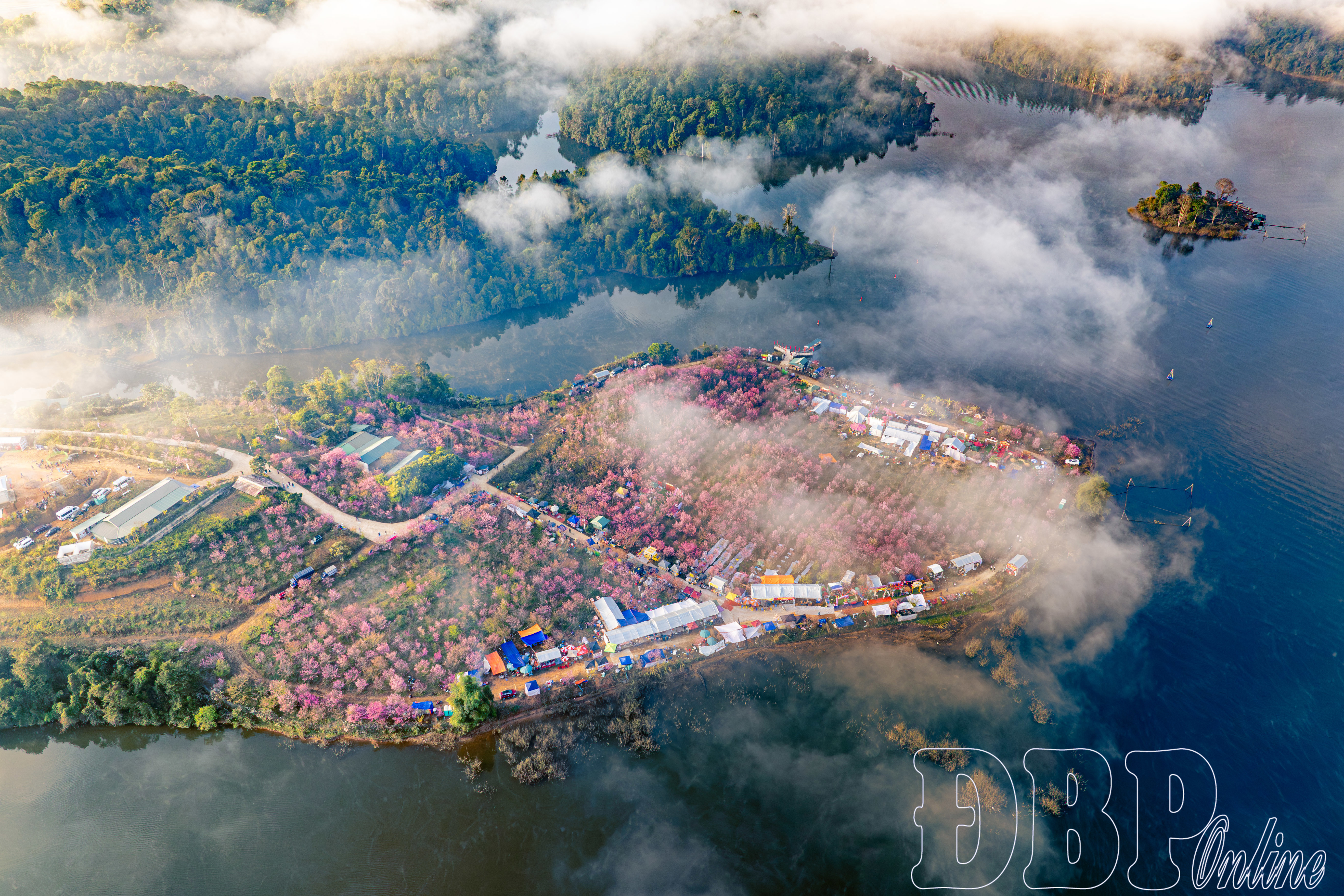 Toàn cảnh đảo hoa anh đào bên lòng hồ Pá Khoang. Ảnh: Tiến Thế