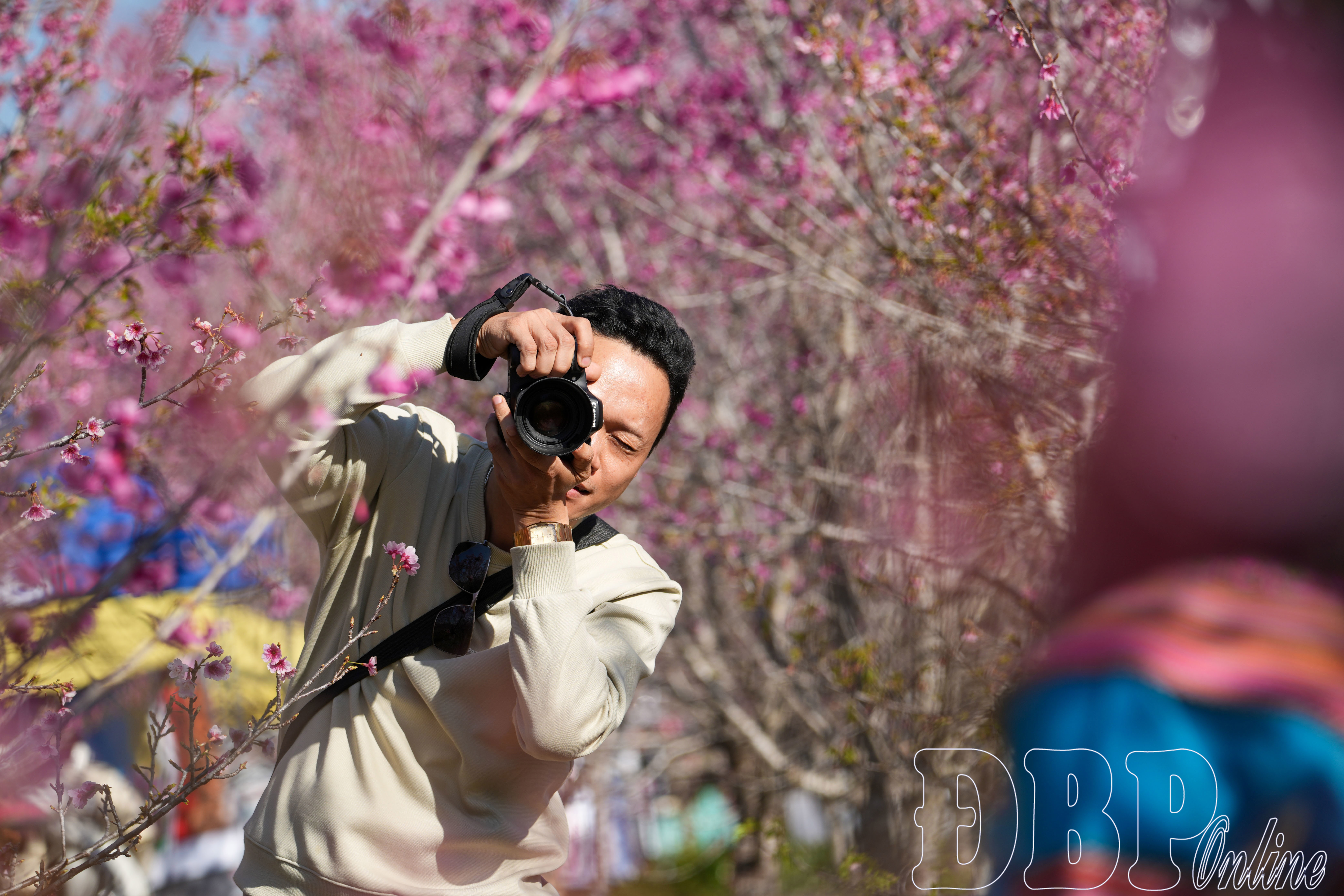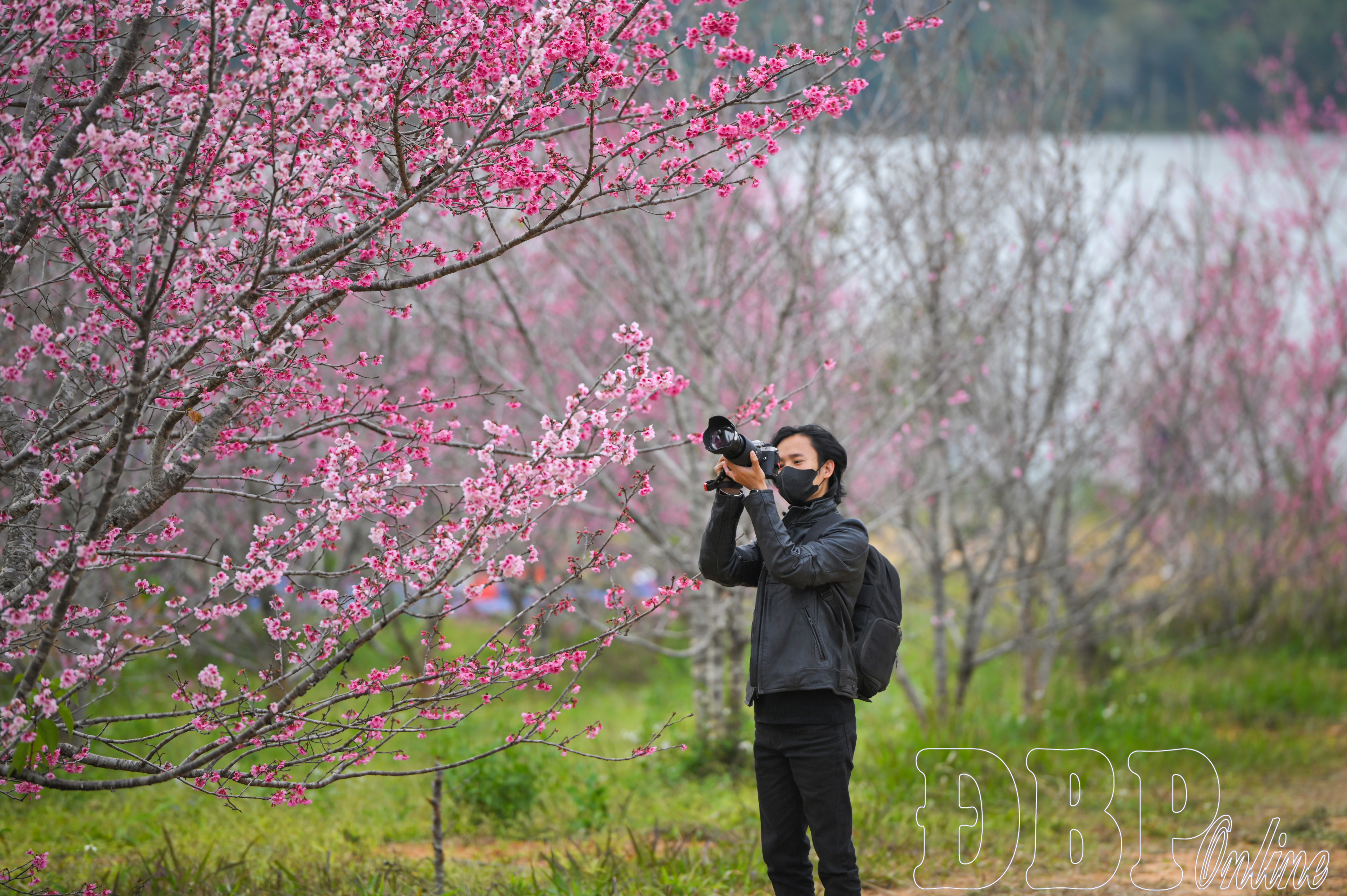 Trong làn sương sớm còn vương nhẹ trên tán cây, các tay máy phong cảnh đã có mặt từ rất sớm để chọn vị trí, căn chỉnh bố cục và đón ánh sáng đầu ngày. Ở những góc chụp cao, toàn cảnh đảo hoa được thu trọn trong khung hình với lớp lớp sắc hồng trải dài, tương phản mềm mại với nền xanh của núi rừng và mặt nước. Ở cự ly gần, những bông anh đào được ghi lại bằng ống kính khẩu độ lớn, tạo nên hậu cảnh mờ mịn, làm nổi bật từng cánh hoa mỏng manh đang rung nhẹ trong gió. Sự kết hợp hài hòa giữa thiên nhiên và kỹ thuật nhiếp ảnh giúp hình ảnh về anh đào giữ được màu sắc trung thực, trong trẻo.