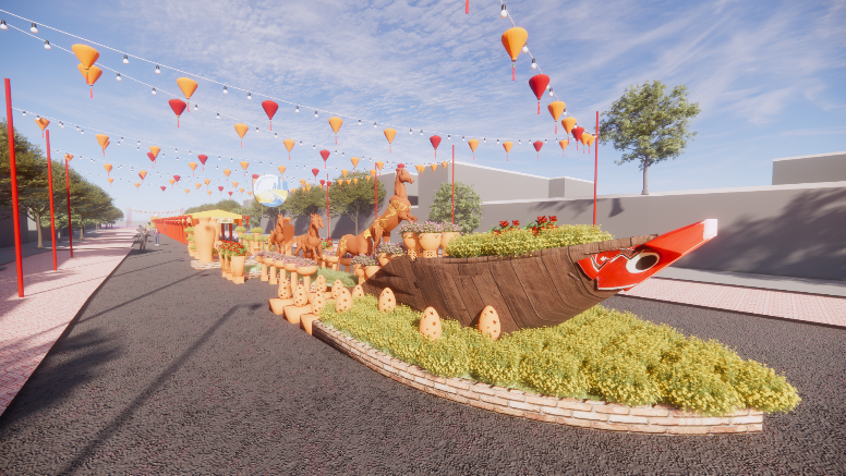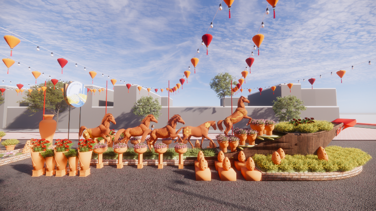 Cụm tiểu cảnh họa tiết thiết kế độc đáo gồm linh vật năm Bính Ngọ, ghe tàu đầy ấp hàng hóa, hoa Xuân mũi ghe hướng ra trục đường chính như hướng ra khơi, mang ý nghĩa sự phát triển, dẫn lối tài lộc, may mắn và thành công…