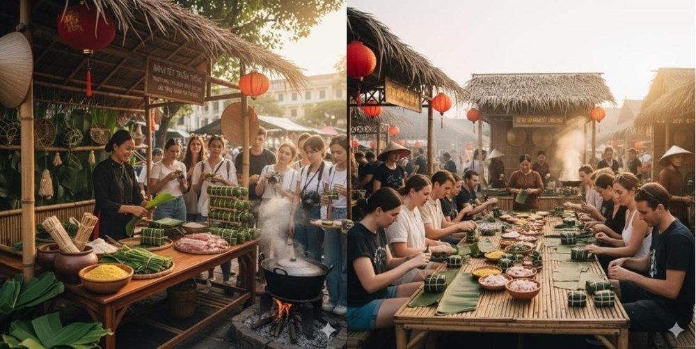 Ngoài ra, còn có không gian trải nghiệm gói và nấu bánh tét Trà Cuôn – loại bánh không thể thiếu trong những ngày Tết truyền thống của người Việt, mang ý nghĩa sâu sắc về sự sum vầy, đoàn tụ gia đình, thể hiện lòng biết ơn tổ tiên và cầu mong một năm mới ấm no, an khang.