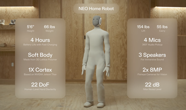 Neo của công ty 1X Technologies nhận mô hình AI mới để di chuyển và tương tác trong môi trường gia đình tốt hơn. Robot sẽ phụ trách việc nhà như giặt giũ, mở cửa, chỉ dẫn đường đi. Nhờ mô hình AI mới mà Neo có khả năng khái quát hóa cao, xử lý với biến số lúc thực hiện nhiệm vụ, nhận biết vật thể không quen thuộc.