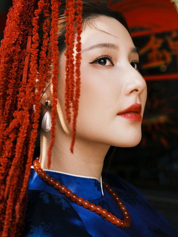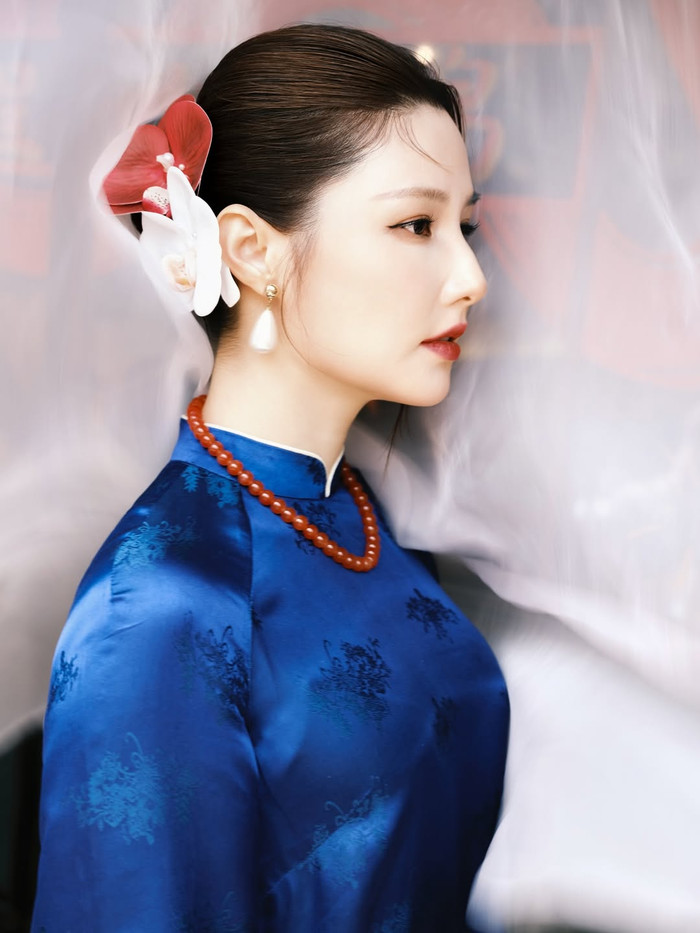 Điểm nhấn trong tạo hình còn đến từ phụ kiện ngọc trai và vòng hạt đỏ nâu, được Diễm My phối khéo léo, không quá cầu kỳ nhưng đủ tạo nét sang trọng. Kiểu tóc được búi gọn gàng, kết hợp cùng hoa cài tóc tông đỏ - trắng nổi bật, mang lại cảm giác vừa truyền thống vừa hiện đại.