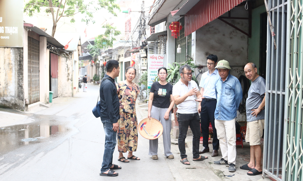 Cán bộ Trung tâm Thoát nước và Xử lý nước thải (Sở Xây dựng) và phường Bắc Giang gặp gỡ người dân ngõ 170, đường Giáp Hải để xác định nguyên nhân gây tắc nghẽn cống thoát nước tại đây.