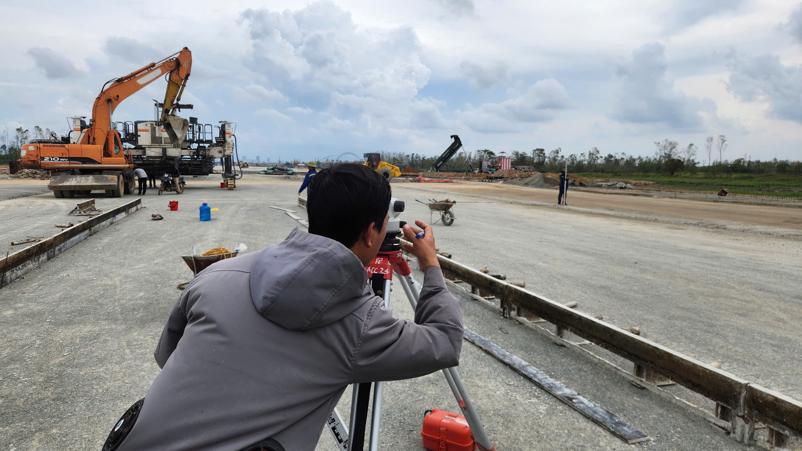 "Đối với 2 đoạn đường lăn, chúng tôi đã đổ xong bê tông M150, đang tiến hành ghép ván khuôn chuẩn bị đổ bê tông tấm dị hình ríc rắc. Tiến độ cơ bản đáp ứng", kỹ sư Trung nói.
