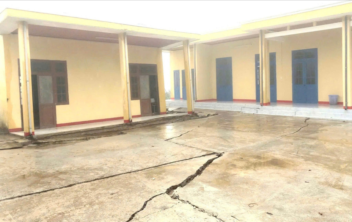 Tại hiện trường, nền nứt toác trượt hẳn xuống taluy tạo thành khe sâu. Nền sân bê tông bị tách khối, gồ lên, tạo thành vết nứt chạy dài vào tận các phòng học. Bên trong khuôn viên và các tường lớp học xuất hiện nhiều vết nứt dọc ngang chạy từ chân tường lên sát mái, tường rào, hàng cột và lối đi bị sụt lún, nứt gãy, nguy cơ đổ sập bất cứ lúc nào.