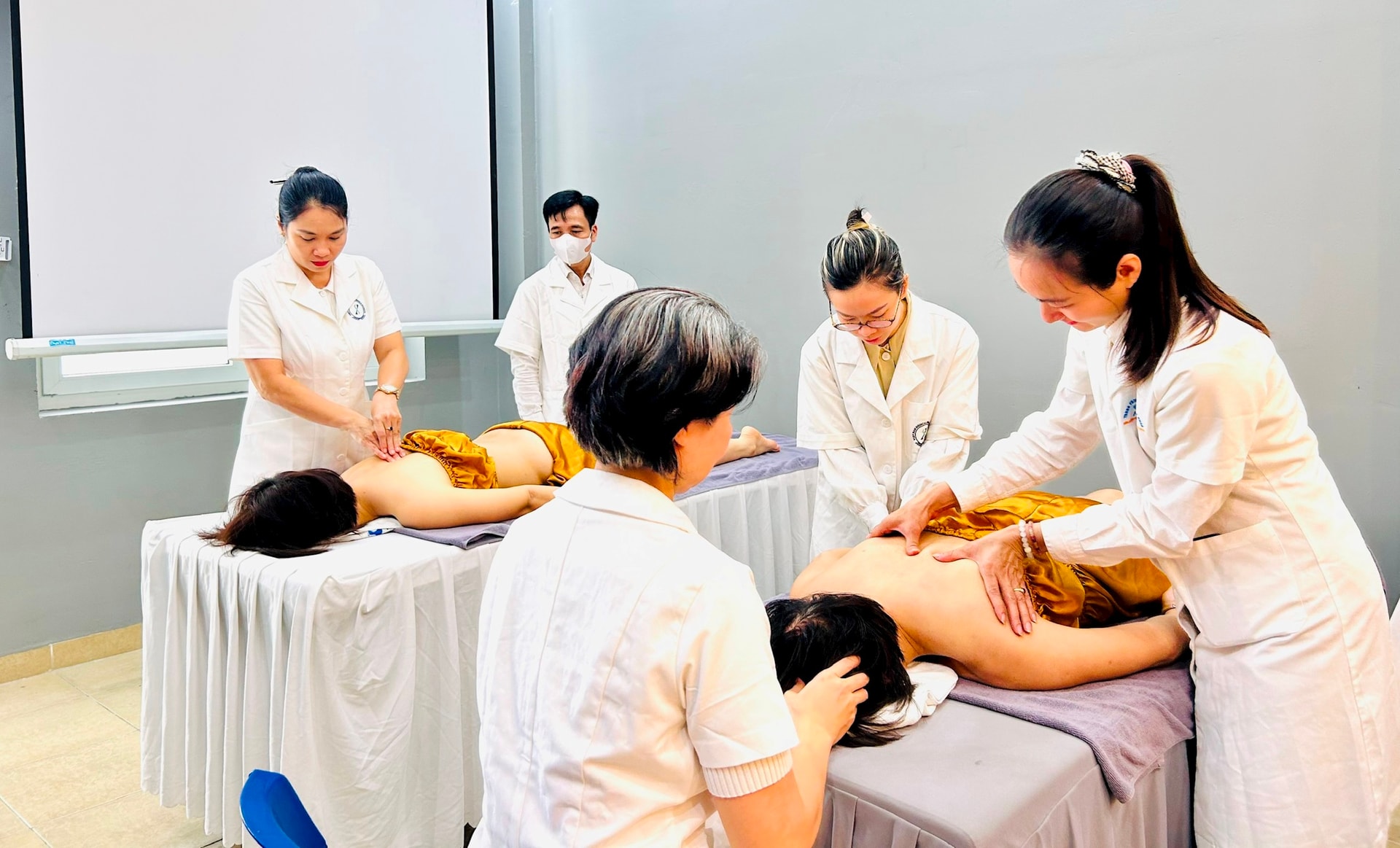 Các học viên học bài xoa bóp bấm huyệt, điều trị liệt nửa người sau tai biến mạch máu não tại Trường Trung cấp Y khoa Việt Nam. Ảnh: Trần Oanh