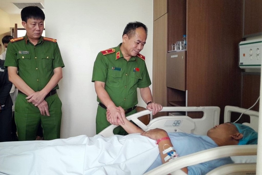 Đồng chí Nguyễn Thanh Tùng ân cần thăm hỏi Thiếu tá Nguyễn Anh Tuấn bị thương khi giải cứu cháu bé. Ảnh: NB