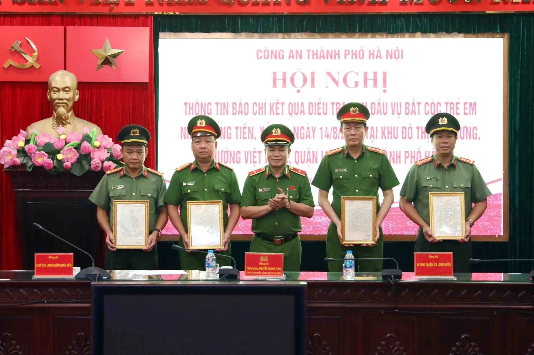 Đồng chí Nguyễn Thanh Tùng trao Thư khen của Bí thư Thành ủy Hà Nội đến các đơn vị trực tiếp giải cứu cháu bé bị bắt cóc, ngày 15-8-2023. Ảnh: NB