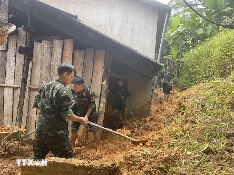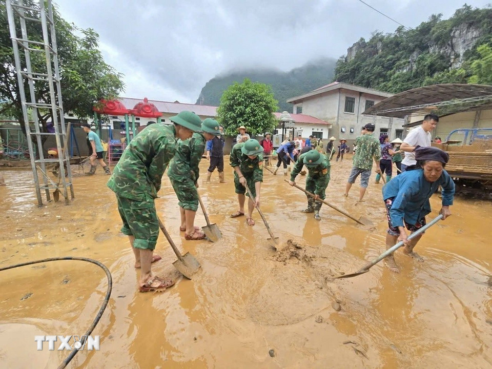 Cán bộ, chiến sỹ bộ đội Biên phòng hỗ trợ người dân khắc phục thiên tai. (Ảnh: TTXVN phát)