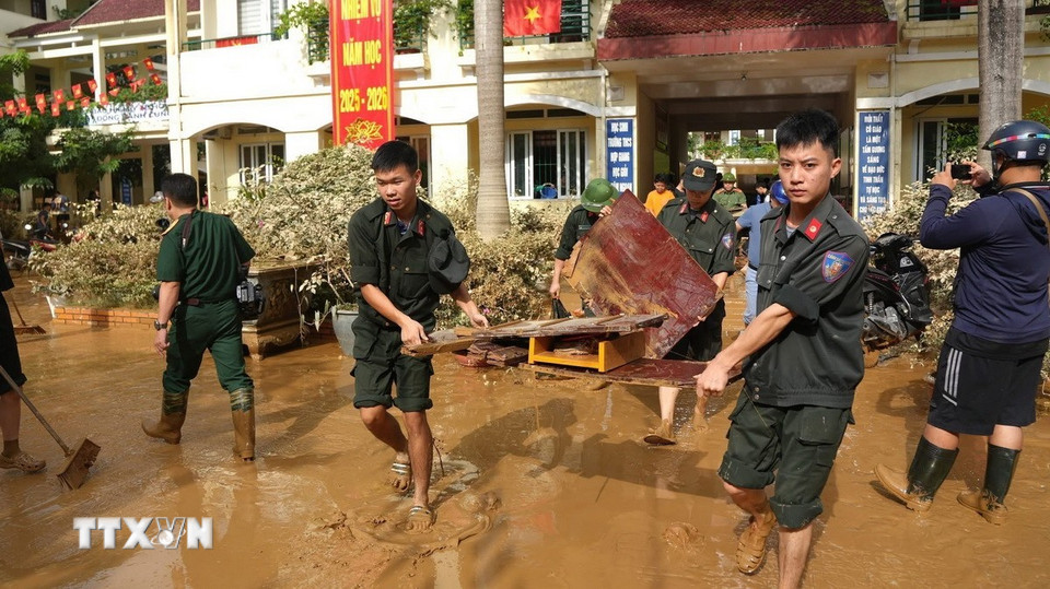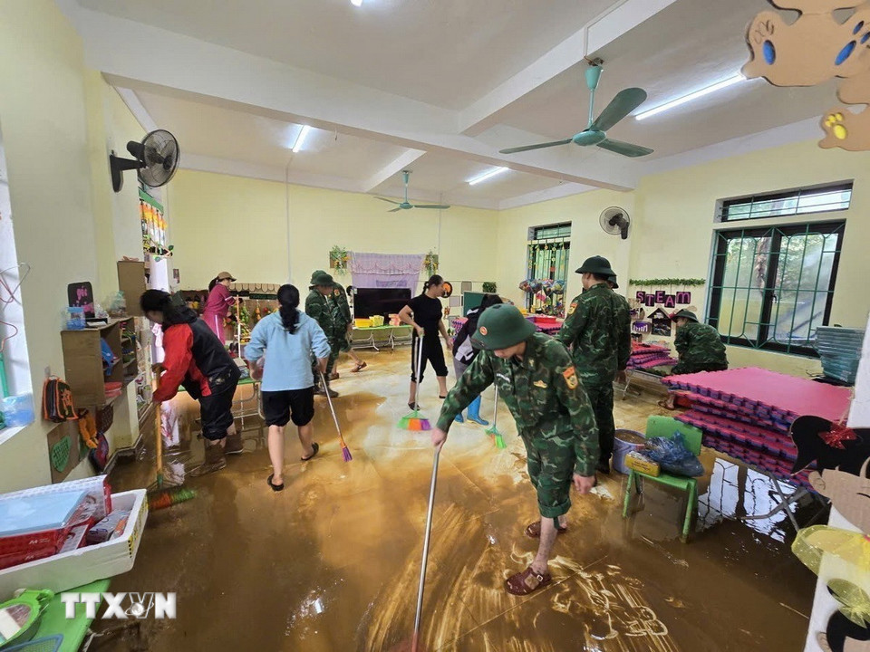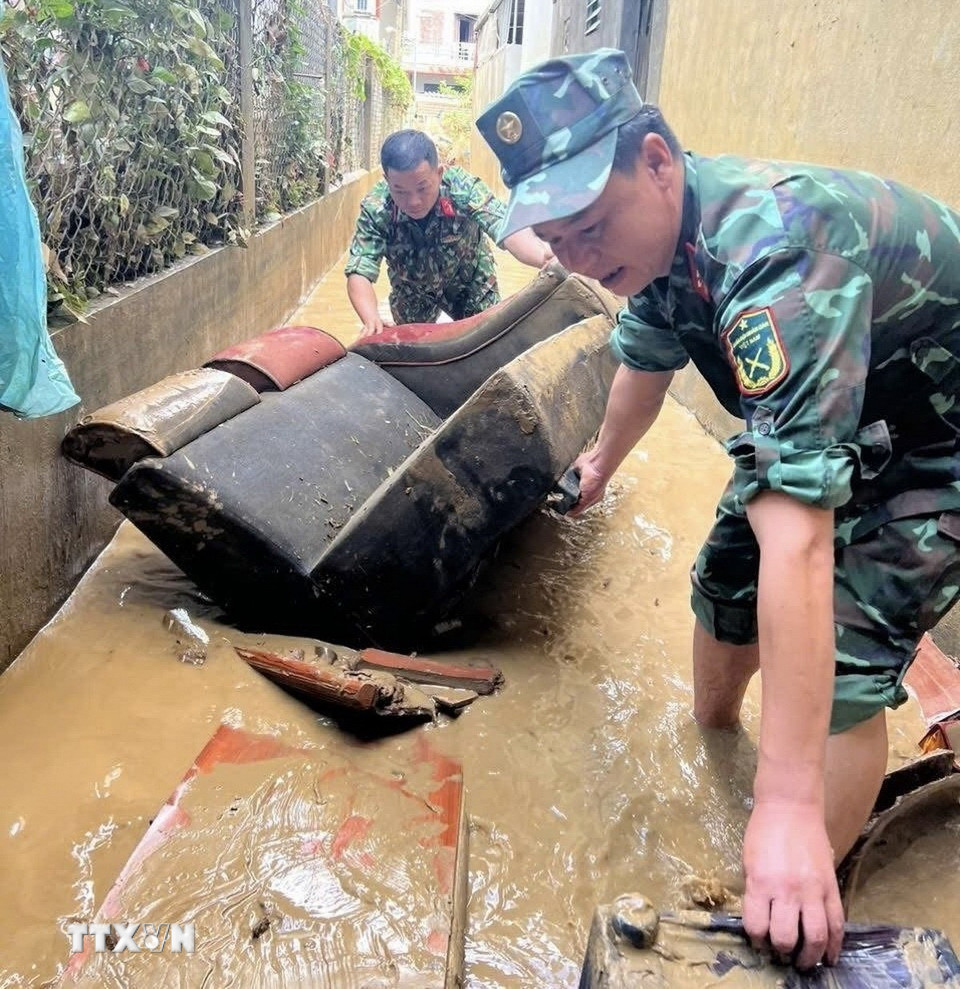 Cán bộ, chiến sỹ Bộ Chỉ huy quân sự hỗ trợ người dân khắc phục thiên tai. (Ảnh: TTXVN phát)