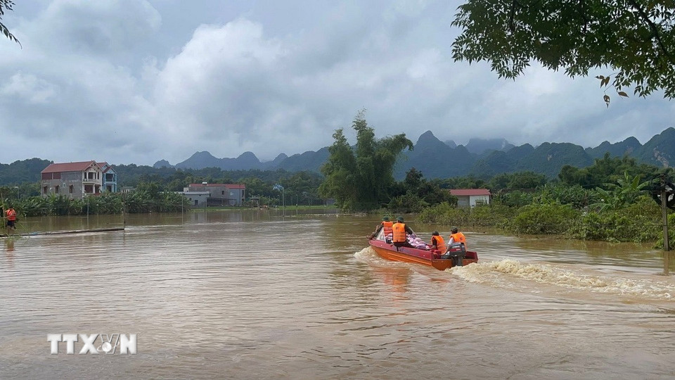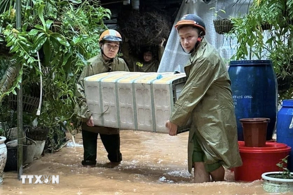 Cán bộ, chiến sỹ lực lượng chức năng hỗ trợ người dân khắc phục thiên tai. (Ảnh: TTXVN phát)