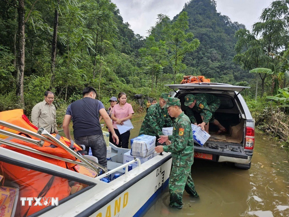 Cán bộ, chiến sỹ Đồn Biên phòng Thị Hoa giúp đỡ người dân trong thiên tai. (Ảnh: TTXVN phát)