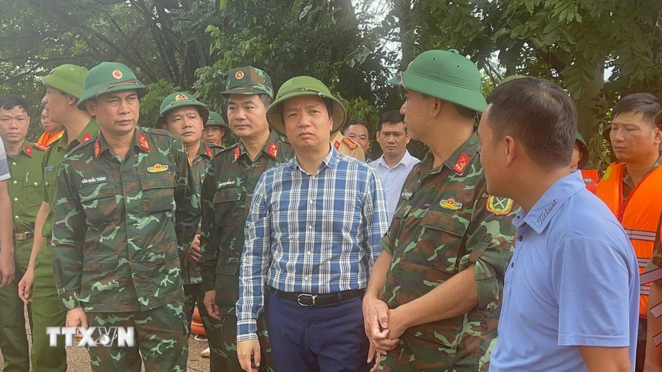 Chủ tịch Ủy ban Nhân dân tỉnh Cao Bằng Lê Hải Hòa động viên cán bộ, chiến sỹ, nhân dân tham gia khắc phục thiên tai tại xã Hòa An. (Ảnh: TTXVN phát)