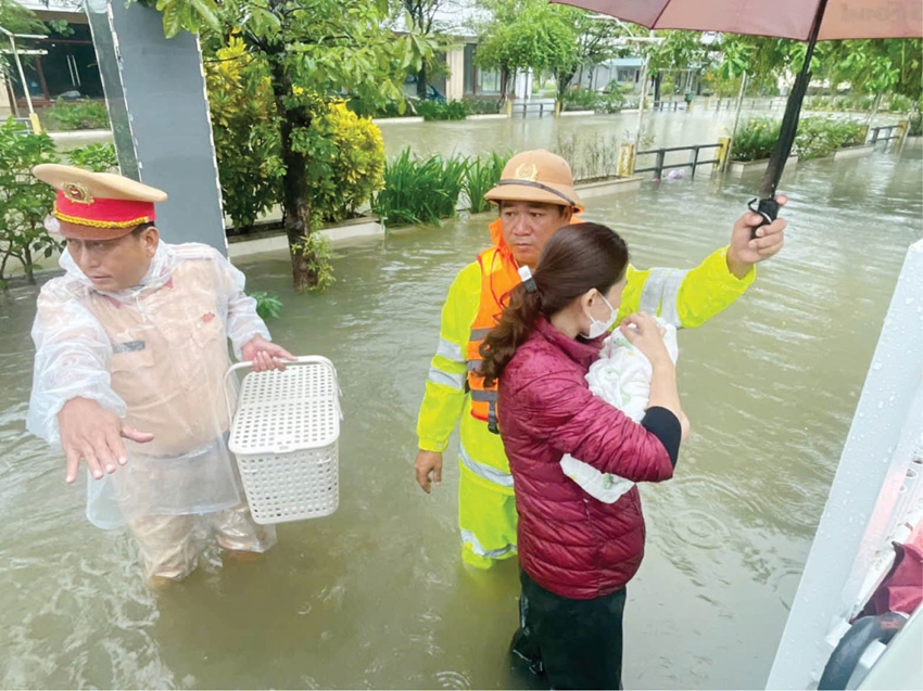 Trước và trong mưa lũ, các chiến sĩ công an còn trực tiếp có mặt ở những vùng nguy hiểm để sơ tán người dân và vận chuyển tài sản đến nơi an toàn. Trong đợt mưa lũ vừa qua, Phòng Cảnh sát PCCC&CNCH Công an TP. Huế đã nhanh chóng thành lập 17 tổ công tác với hàng trăm cán bộ, chiến sĩ và huy động 17 phương tiện thủy, 5 xe chữa cháy và cứu hộ, cứu nạn thường trực 24/24 để ứng phó kịp thời. Qua đó, đã hỗ trợ hơn 1.500 người dân tại các khu vực nguy hiểm, đưa hơn 300 lượt người cao tuổi, trẻ em và phụ nữ mang thai từ các khu ngập sâu đến nơi an toàn, đưa 59 trường hợp bệnh nhân nguy kịch đi cấp cứu và tiếp nhận gần 50 người dân tránh trú, cung cấp thức ăn, quần áo, chỗ nghỉ ngơi an toàn.