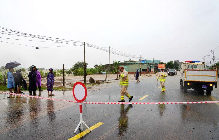 Lực lượng Cảnh sát giao thông lập rào chắn, hướng dẫn nhân dân không đi qua khu vực nguy hiểm