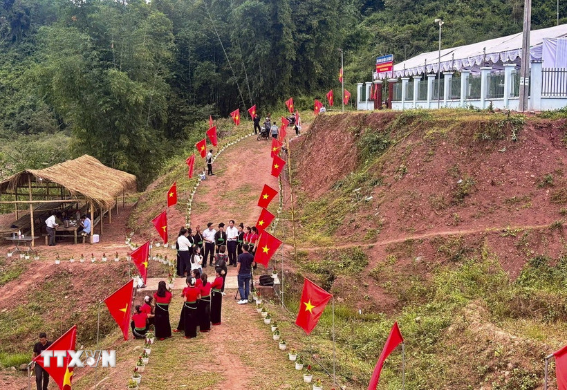 Bản Nậm Kè rực rỡ cờ hoa chào đón Tết cổ truyền dân tộc Cống. (Ảnh: TTXVN phát)