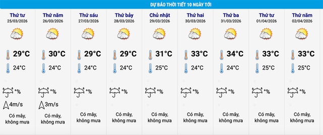 Theo bảng cập nhật thời tiết và nhiệt độ 10 ngày tới, Hà Nội có mây, không mưa trong các ngày 25-28/3, nhiệt độ cao nhất dao động 29-30 độ C, thấp nhất 24 độ C. Ngày 29/3, khu vực này duy trì trạng thái có mây, không mưa, nhiệt độ tăng nhẹ, cao nhất 31 độ C, thấp nhất 25 độ C.