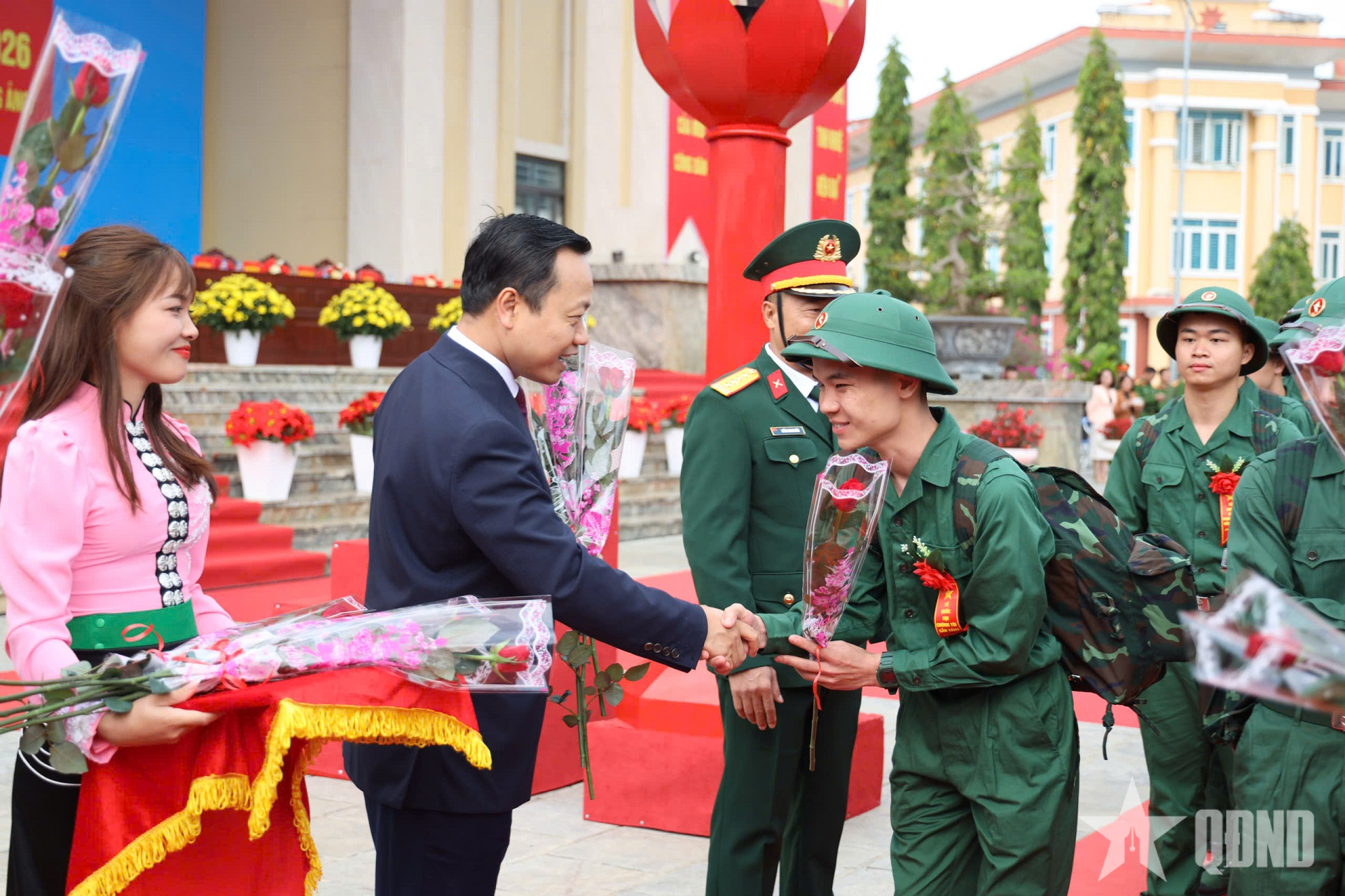 Thiếu tướng Nguyễn Ngọc Ngân, Phó chủ nhiệm Chính trị Quân khu 2 tặng hoa, động viên thanh niên nhập ngũ.