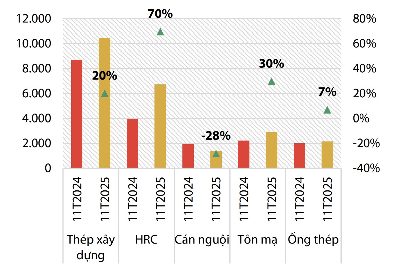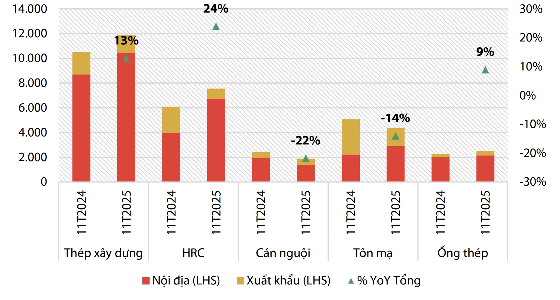 Ngành thép năm 2025 chứng kiến sự phân hóa rõ rệt giữa nhóm thép xây dựng, thép cuộn cán nóng (HRC) và nhóm tôn mạ. Theo Chứng khoán Rồng Việt (VDSC), sản lượng tiêu thụ thép xây dựng, HRC và ống thép 11 tháng đạt 11,8 triệu tấn (+13% YoY); trong đó thị trường nội địa đạt 10,4 triệu tấn (+20% YoY) và xuất khẩu đạt 1,4 triệu tấn (-22% YoY).