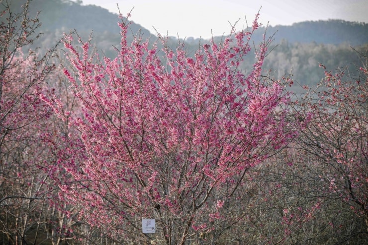 Đảo hoa nằm ở độ cao hơn 1.000 m so với mực nước biển, sở hữu khí hậu mát mẻ quanh năm với nền nhiệt thấp hơn hẳn các vùng lân cận. Đây là điều kiện lý tưởng để hơn 20 giống hoa anh đào Nhật Bản sinh trưởng và phát triển. Đáng chú ý, nhiều gốc cây tại đây đã đạt chiều cao từ 6-7 m, những cây càng nhiều tuổi thường cho lượng hoa dày đặc và rực rỡ hơn.