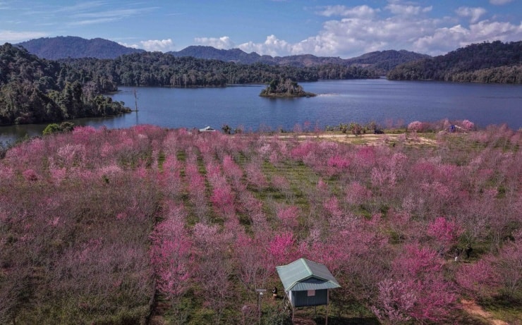 Những ngày đầu năm mới, khu vực hồ Pá Khoang tại xã Mường Phăng, tỉnh Điện Biên trở thành điểm đến thu hút khi hàng nghìn gốc hoa anh đào Nhật Bản đồng loạt bung nở. Sắc hồng rực rỡ phủ khắp hòn đảo nhỏ giữa lòng hồ thủy điện, tạo nên một không gian thơ mộng cách trung tâm tỉnh khoảng 20 km. Địa điểm này thường được người dân địa phương và du khách ưu ái gọi tên là "đảo hoa" của vùng đất lịch sử Điện Biên.