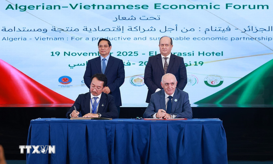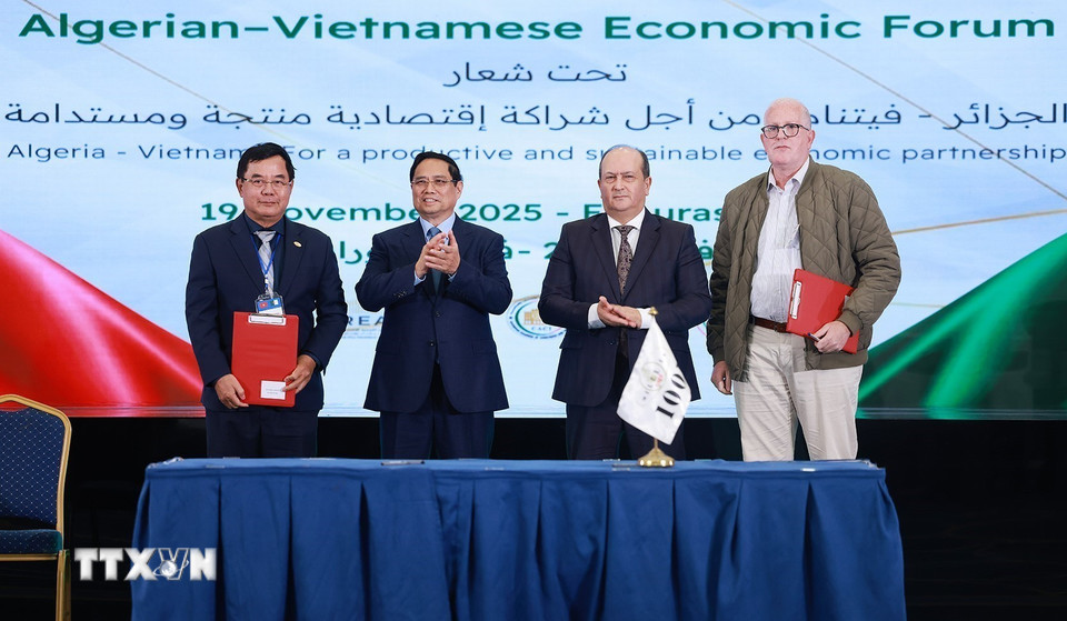Thủ tướng Phạm Minh Chính và Thủ tướng Algeria Sifi Ghrieb chứng kiến ký kết giữa các doanh nghiệp Việt Nam và Algeria. (Ảnh: Dương Giang/TTXVN)