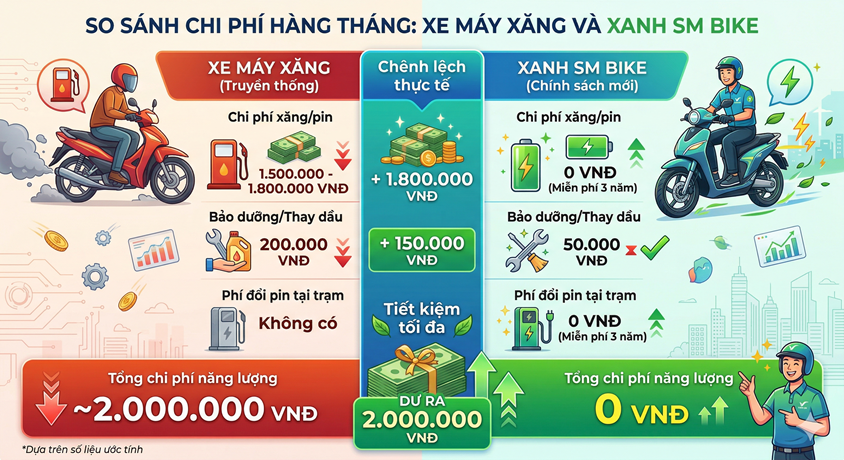 Khi tìm hiểu về chính sách mới của Xanh SM, anh Minh bắt đầu làm những phép tính thực tế trên mặt giấy. Với gói hỗ trợ trả góp và đặc biệt là đặc quyền miễn phí thuê, đổi pin trong vòng ba năm, số tiền đổ xăng tiết kiệm được mỗi tháng hiện tại hoàn toàn đủ để anh chi trả cả gốc lẫn lãi góp một chiếc xe điện mới.