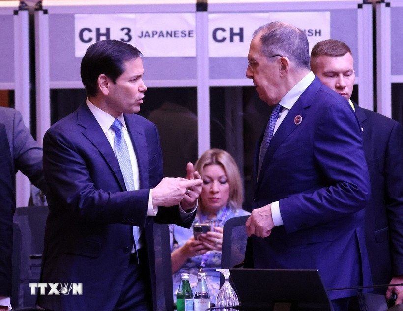 Ngoại trưởng Mỹ Maro Rubio và Ngoại trưởng Nga Sergey Lavrov trao đổi tại Hội nghị Bộ trưởng Ngoại giao Hội nghị cấp cao Đông Á lần thứ 15, ngày 11/7 tại Kuala Lumpur, Malaysia. (Ảnh: TTXVN phát)