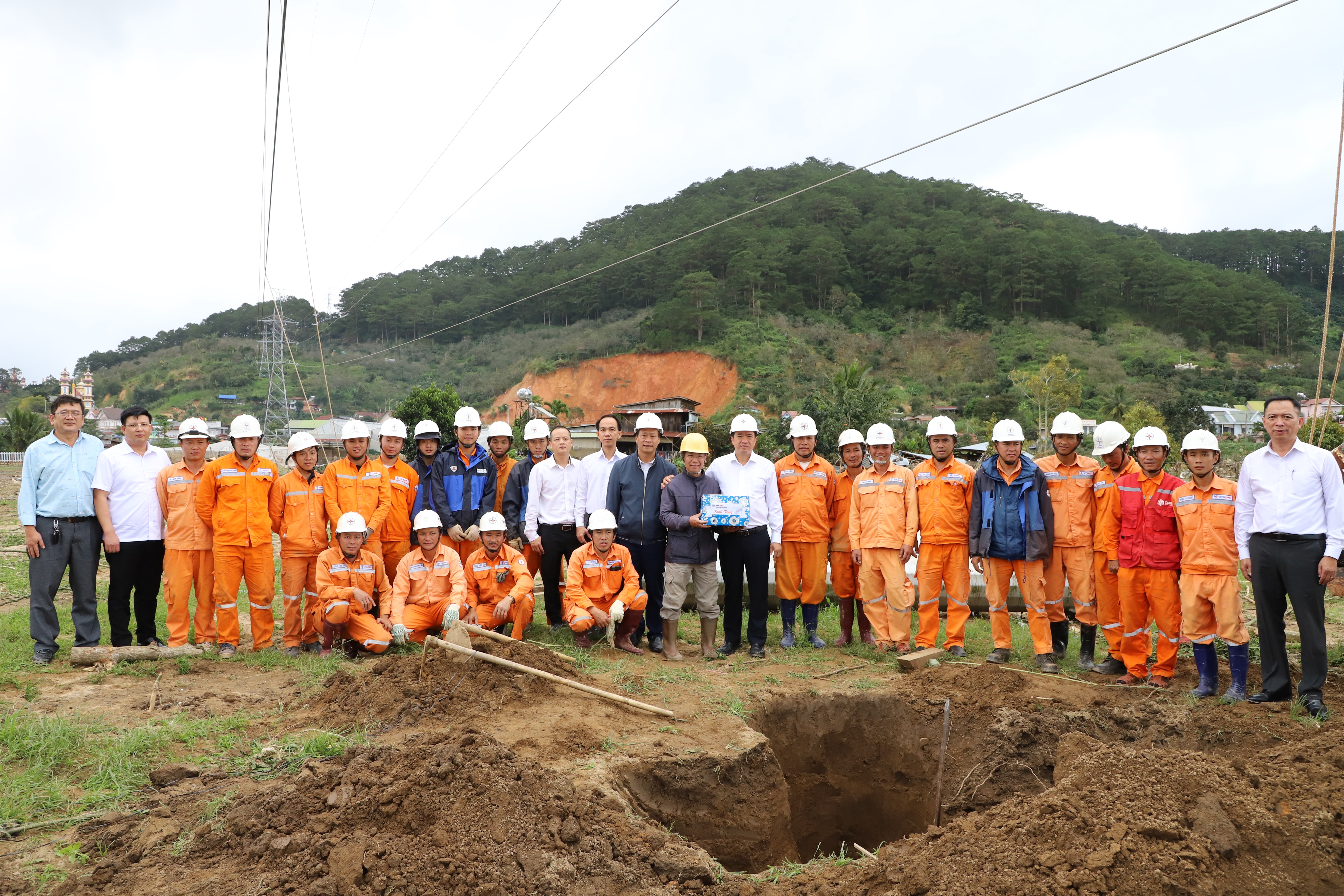 Ông Phan Sỹ Duy, Giám đốc Công ty Điện lực Lâm Đồng và Đoàn công tác tặng quà động viên lực lượng khắc phục sự cố lưới điện