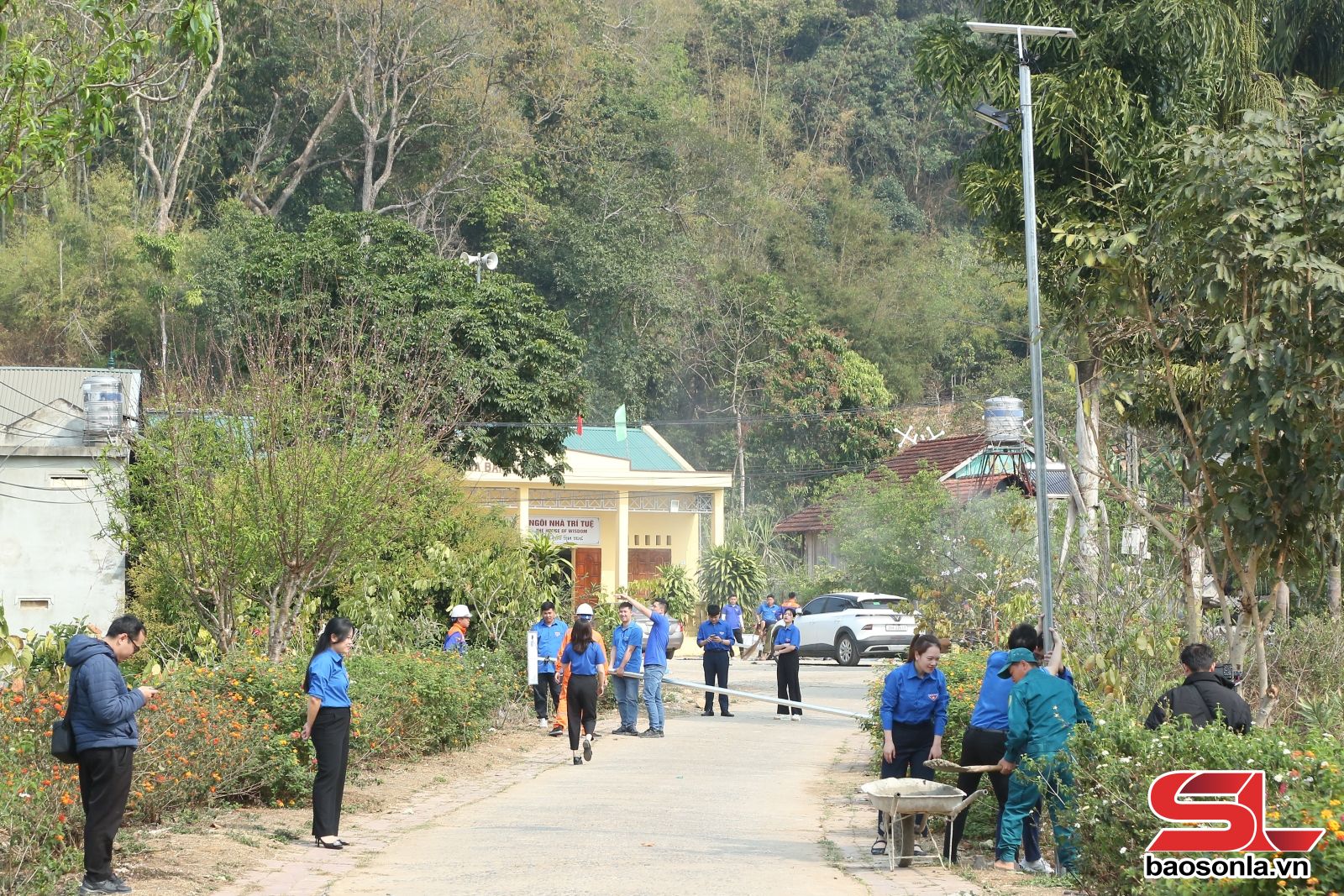 ĐVTN Công ty Điện lực Sơn La và các đơn vị lắp đặt hệ thống chiếu sáng tuyến đường nội bản Nong La, phường Chiềng Sinh.