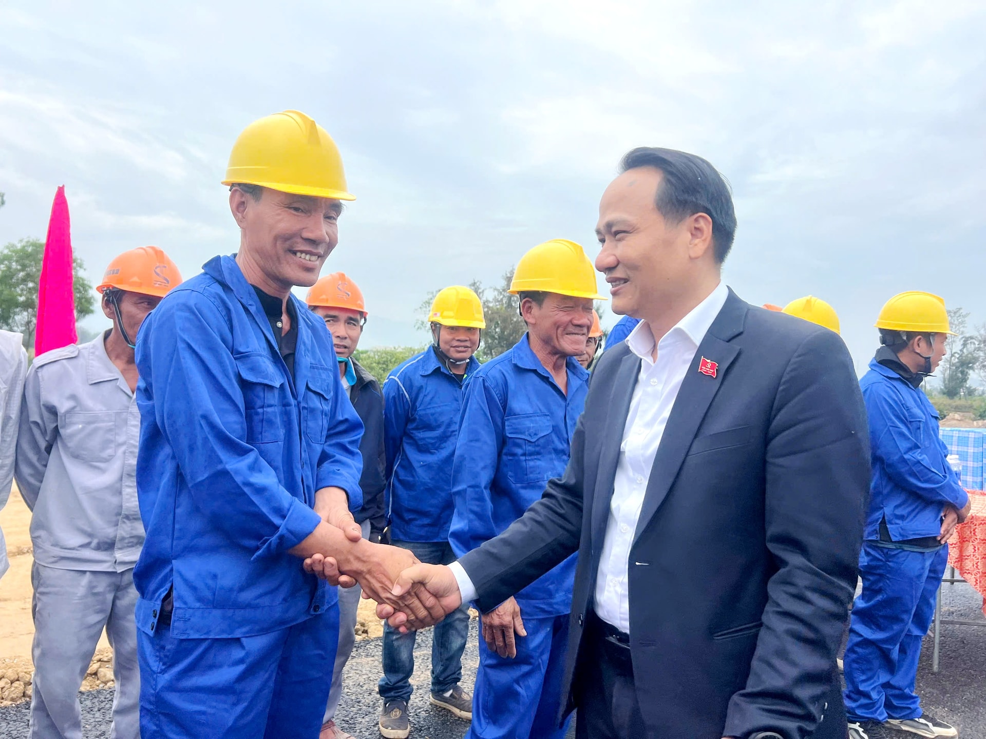 Phó Bí thư Thường trực Thành ủy Đà Nẵng Nguyễn Đình Vĩnh động viên công nhân thi công thành phần 1 Dự án hoàn thiện đường ven biển 129. Ảnh: CÔNG TÚ