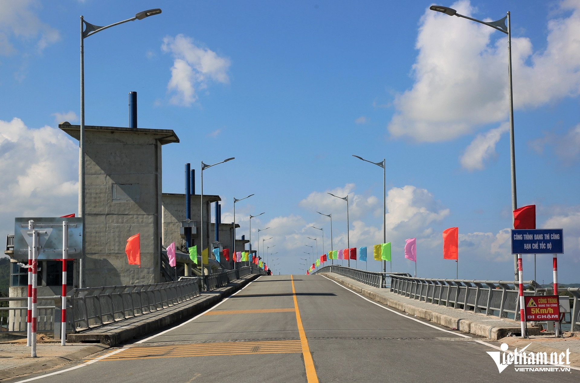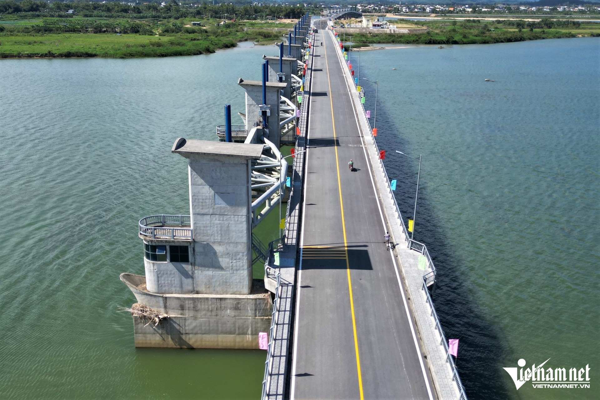 Dòng xe lưu thông trên đập dâng hạ lưu sông Trà Khúc.