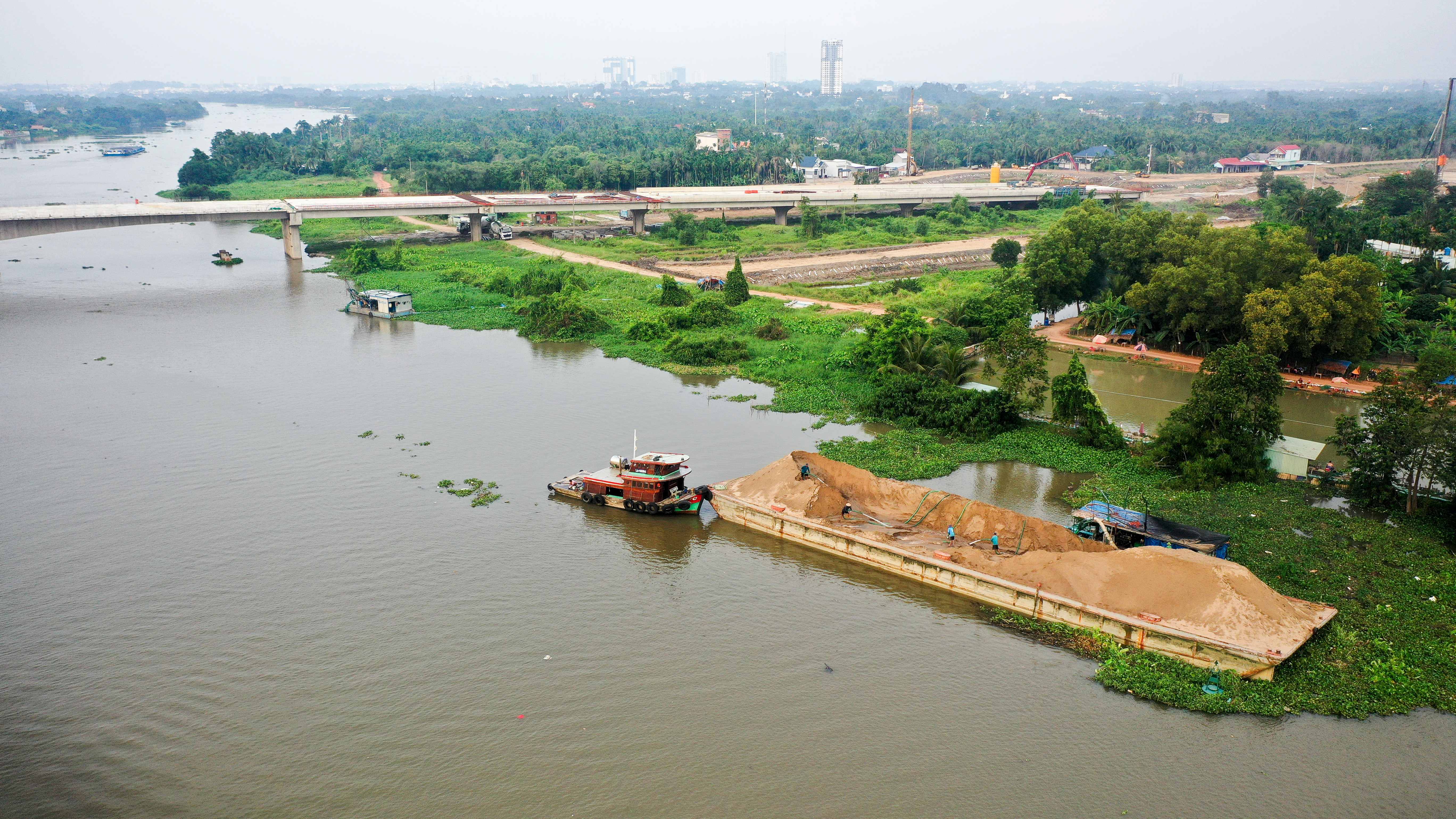 Một sà lan chở cát từ miền Tây cập bờ sông, bơm cát phục vụ san lấp mặt bằng đường dẫn vào cầu Bình Gởi. Thời gian qua,việc khan hiếm nguồn cát sang lấp là một trong những nguyên nhân chính làm ảnh hưởng tiến độ dự án
