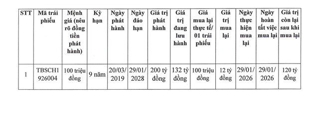 Mã trái phiếu TBSCH1926004 được Trung Nam Group phát hànhngày 20/3/2019 và đáo hạn ngày 29/1/2028 với giá trị phát hành 200 tỷ đồng. Ngày29/1/2026, Trung Nam Group đã thực hiện mua lại trước hạn một phần trái phiêúTBSCH1926004 với giá trị mua lại là 12 tỷ đồng. Sau khi mua lại, giá trị còn lạicủa trái phiếu TBSCH1926004 là 120 tỷ đồng.