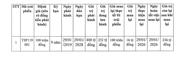 Trong đó, mã trái phiếu TSP119001 được phát hành ngày29/1/2019, đáo hạn ngày 29/1/2028 với giá trị phát hành là 400 tỷ đồng. Tính đếnngày 29/1/2026, Trung Nam Group đã thực hiện mua lại trước hạn 16 tỷ đồng tráiphiếu. Giá trị còn lại sau khi mua lại trước hạn là 236 tỷ đồng.
